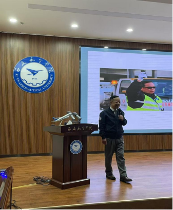 曹佳以幽默诙谐、内涵丰富的“老曹讲故事”主题开篇,用生动形象、客观具体的民航发展真实案例,重温发展史,对话西航人。他讲述了自己作为一名从事民航安全工作者的发展历程、成长故事以及体会感悟。他提到,要敬畏生命、敬畏规则,在飞机起飞前、飞行中、落地后都要重视安全检查,充分保障乘客安全。他说到,民航是个大家庭、大团体,大家各司其职、各尽其能,都在自己平凡的岗位上不断书写着民航发展的伟大篇章。希望各位西航学子,继承和发扬老一辈民航人积极向上、吃苦耐劳、潜心研究、创新拼搏的航空精神,厚植家国情怀,培养浓厚兴趣,掌握技能本领,夯实专业基础,肩负发展使命,站在今天民航事业蓬勃发展的绚烂舞台上奋发有为、卓越成就民航发展新篇章。