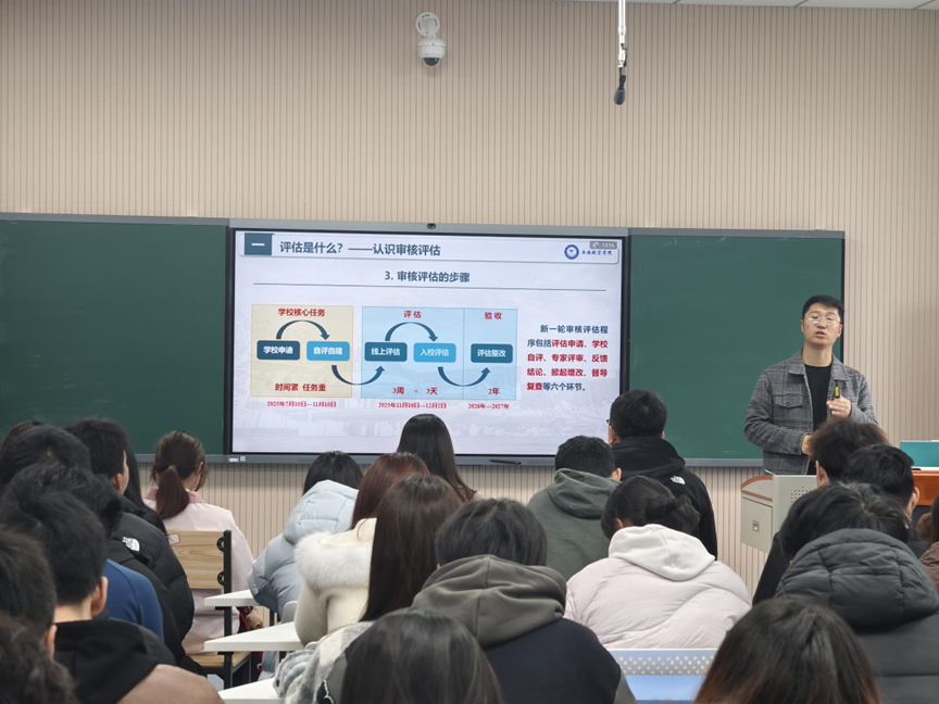 王宏超围绕审核评估的定义、实施步骤、核心受益点及学生行动指南进行解读,通过PPT图表与案例相结合的形式,阐明“评估是推动学校高质量发展的长期工程,而非临时任务”,助力学生干部全面把握评估重点与工作逻。